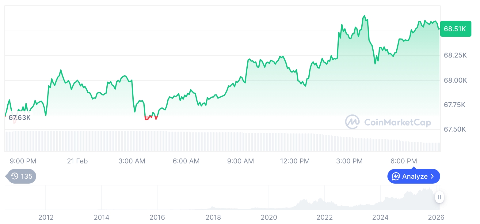 市场震荡中比特币强势收复失地,以太经典单日暴涨超15% 尽管美国最高法院的关税裁决与特朗普总统追加关税的声明加剧了市场波动,比特币仍收复全部跌幅,重回68,000美元关口。在竞争币市场中,以太经典在24小时内飙升超过15%,成为周末行情的主角。 比特币在上周末成功捍卫65,000美元支撑位后,启动一轮意外的强势反弹,在一周内重新攀升至71,000美元附近。然而,该水平卖压巨大,导致本周初价格回调,周一在触及70,000美元后涨势受阻。 随后几个交易日卖压持续,周四一度下探至65,600美元。但该价位迅速吸引买盘涌入,推动价格在短时间内反弹约3,000美元。 关税议题真正撼动市场是在周五。美国最...