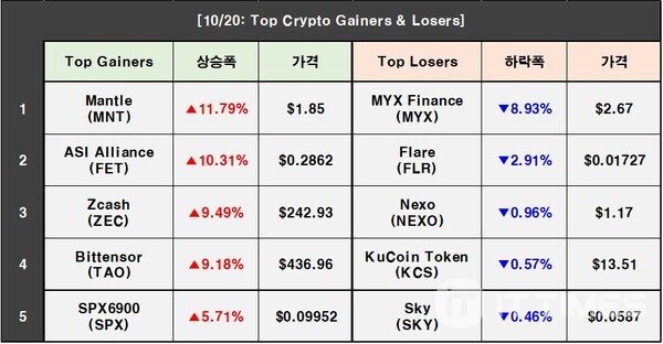 10月20日加密货币行情:比特币微涨0.94%,MNT飙升11.79%,MYX回调8.93%