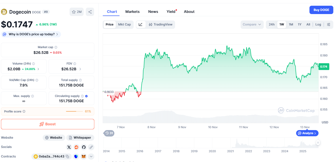 过去一周狗狗币价格呈现颓势,CoinMarketCap数据显示其交易区间维持在0.16-0.18美元。