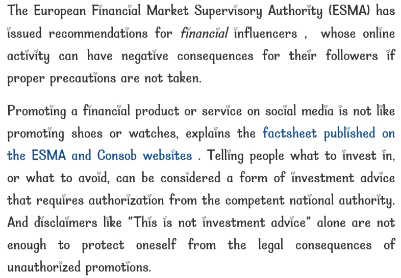 CONSOB重申ESMA对投资者的建议:对"快速致富"承诺保持警惕,同时敦促意见领袖核实所推广平台与项目的合规授权。监管警告称,未尽审核义务可能引发法律后果。