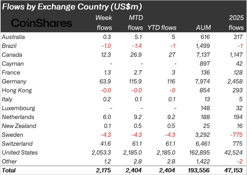 从地区分布看,美国占资金流入的主要部分,但其他国家也呈现强劲需求。德国流入6390万美元,瑞士4160万美元,加拿大1230万美元,荷兰600万美元。