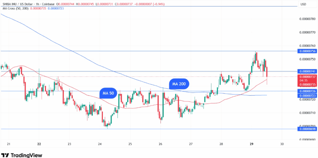柴犬币在2025年最后72小时内的短期小时图呈现看涨黄金交叉形态。该形态出现在50小时均线上穿200小时均线之际,通常预示潜在上涨趋势和短期价格动能。此技术突破始于12月26日的温和反弹,柴犬币从0.000007美元攀升,并于周一触及0.0000074美元的短期高点。截至报道时,该代币24小时内上涨2.82%,交易价格约为0.000007382美元。