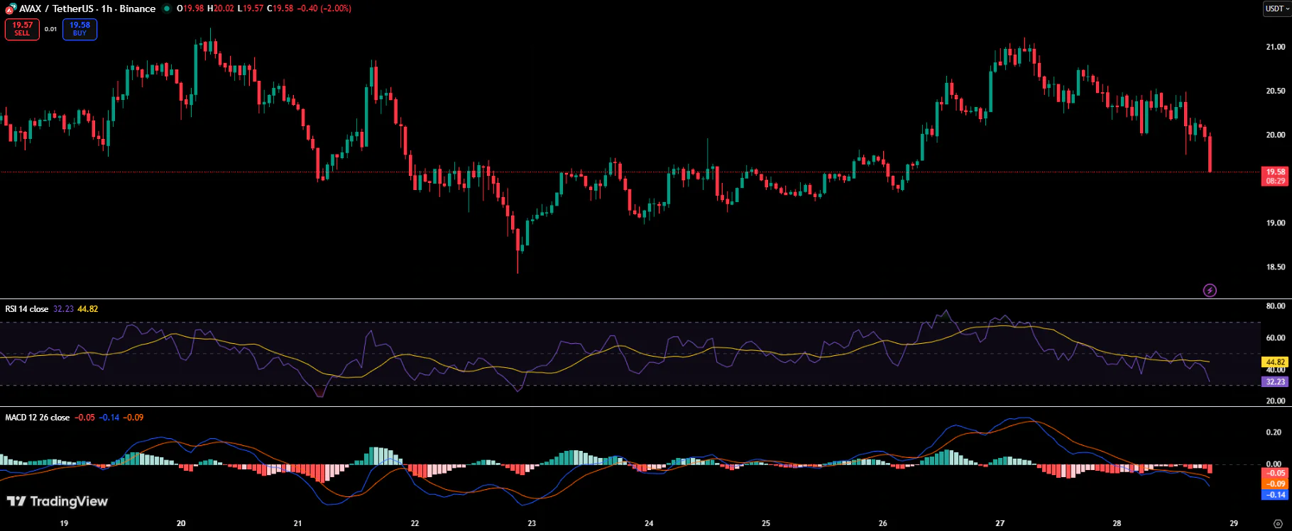 截至撰稿时,Avalanche(AVAX)交易价格约为19.58美元,过去24小时下跌2%。该代币难以维持在20美元支撑位上方,且在21美元附近持续遭遇阻力。