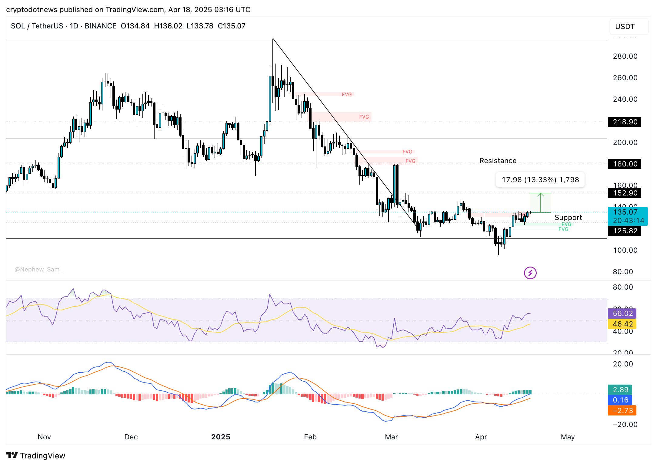 两个关键动量指标RSI和MACD支持Solana的看涨论点。中性线上方的绿色直方图柱和向上倾斜的RSI读数56表明SOL价格上升趋势中存在潜在的正向动能。Solana可能上涨13.33%并测试152.90美元水平,这是一个关键阻力位,之前也是山寨币的关键支撑位。如果Solana成功将152.90美元从阻力位转为支撑位,可能会向180美元的阻力位发起冲击,这是山寨币在整个3月和2025年4月前两周的粘性阻力位。