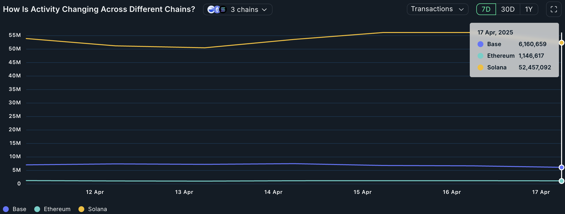 在交易数量方面,根据Nansen数据,Solana在过去七天内以5200万笔交易领先,而以太坊和Base则落后。这与活跃地址的数据一致。