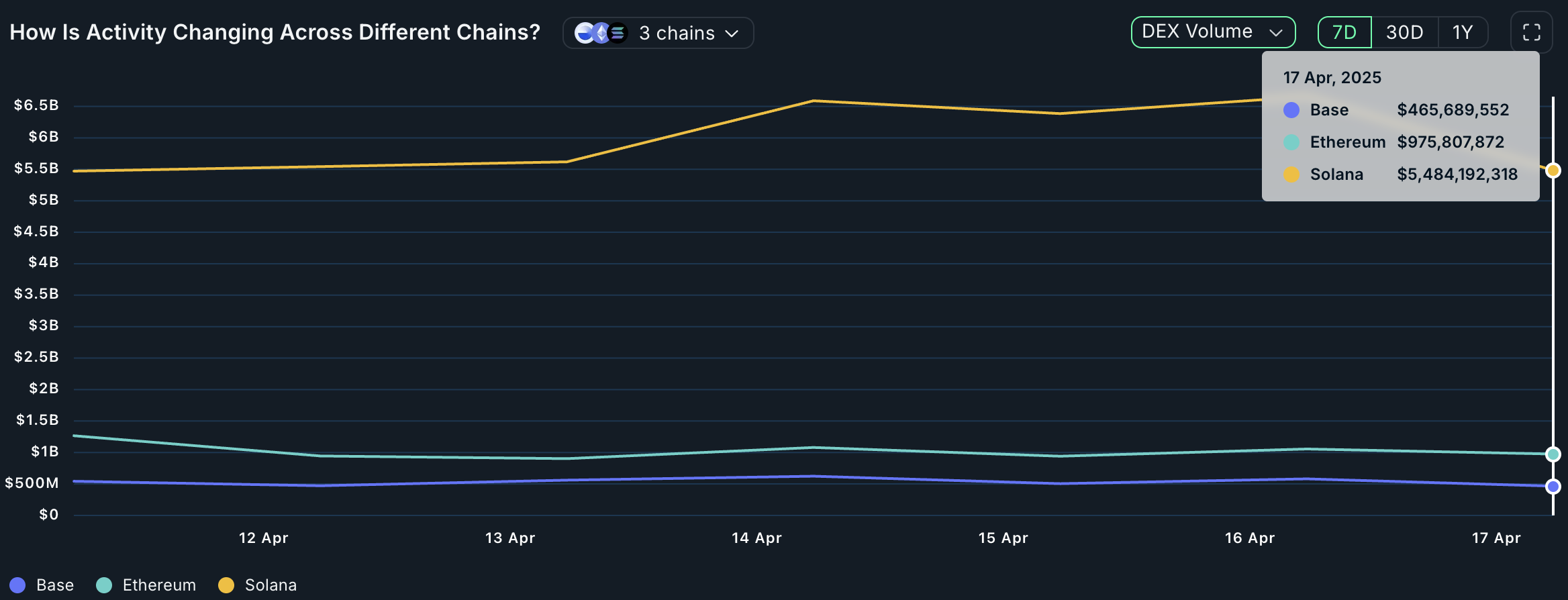比较三个链的DEX交易量,Solana以超过54.8亿美元领先,以太坊以9.75亿美元排名第二,Base以4.65亿美元紧随其后。