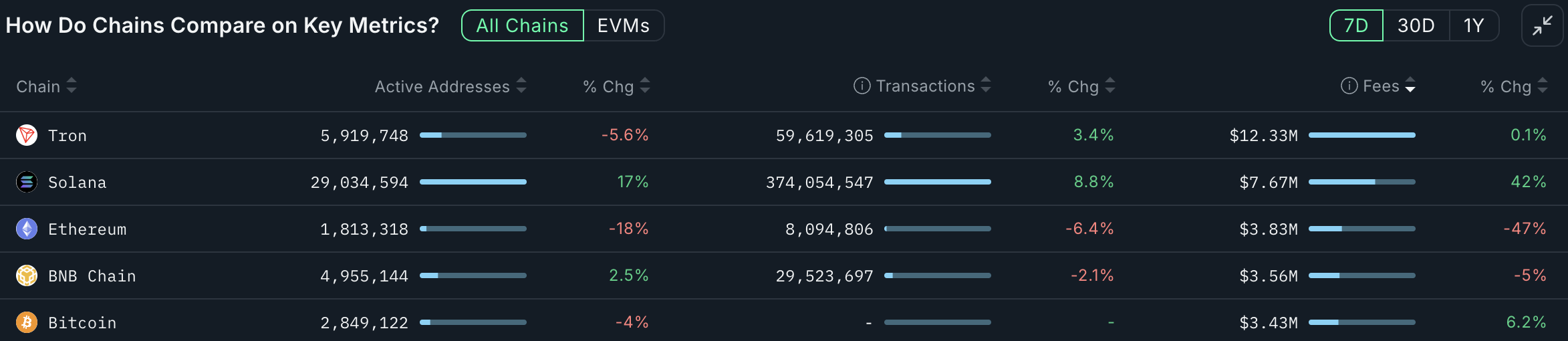 Nansen的链上数据比较了Solana、Base和以太坊的活动。SOL在过去七天内以超过400万个活跃地址领先。Base排名第二,以太坊排名最低。更高的活跃地址数量显示了代币在市场参与者中的相关性和需求。