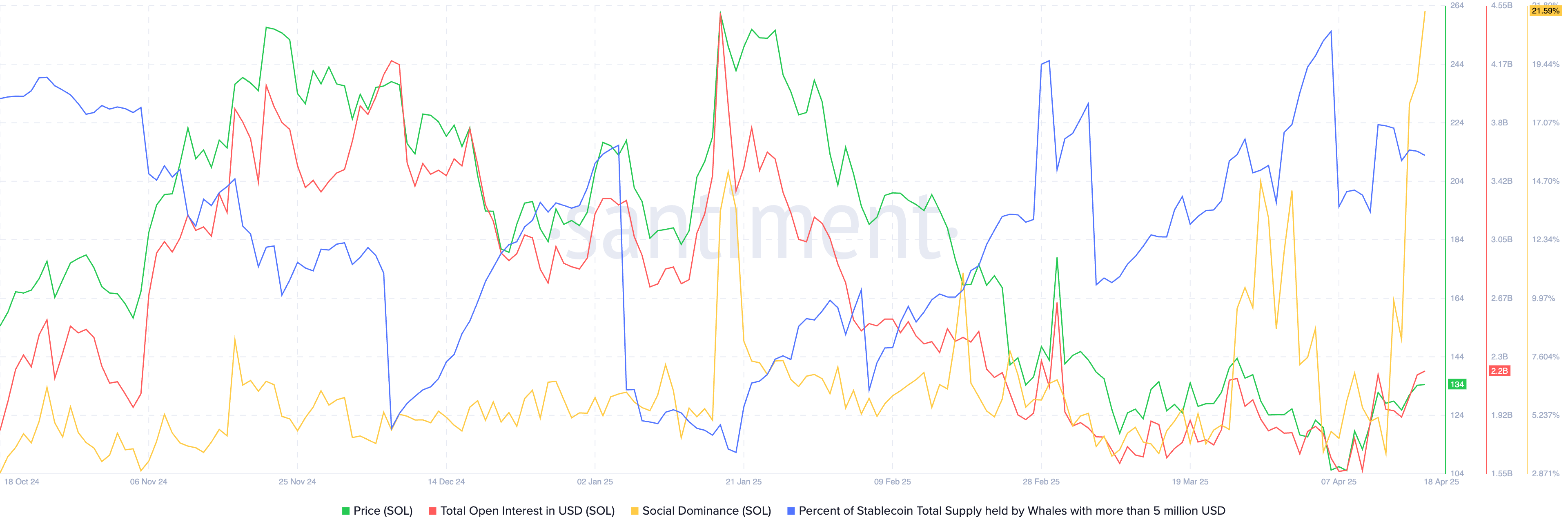 Santiment数据显示,周五社交主导度大幅上升,从4月15日的8.30%上升到4月18日的21.59%。随着社交主导度的上升,Solana的总未平仓合约(以美元计)也有所上升。这意味着在同一时间段内,Solana的未平仓多头和空头头寸的总价值有所增加,支持了Solana价格上涨的论点。