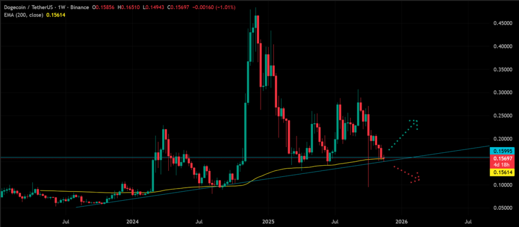DOGE目前处于多个技术层面的交汇点:包括0.1561美元的200周EMA均线、2023年以来的长期上升趋势线,以及历经多次回调验证的水平支撑位。