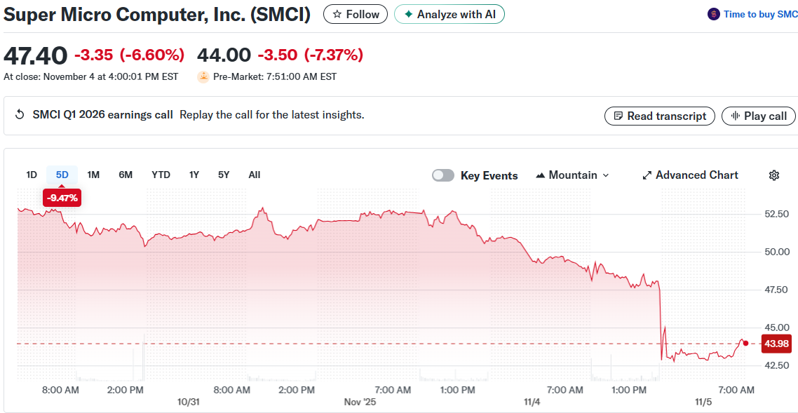 超微电脑公布令人失望的第一季度业绩后,周三盘前交易中股价下跌逾9%。这家AI服务器制造商公布每股收益35美分,营收50.2亿美元。