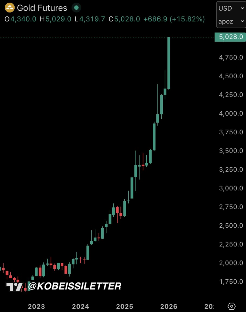 黄金价格首次突破5000美元大关,而与此同时,加密货币市场却波澜不惊。比特币仍陷于窄幅区间内,尽管推动黄金上涨的担忧情绪真实存在。
