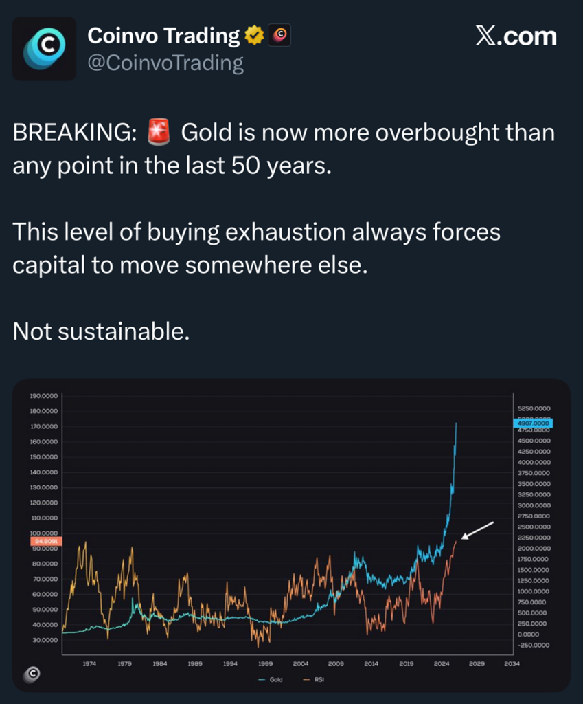 这些例子揭示了一个重要规律:黄金常在恐惧时期引领市场,比特币则倾向于在市场停止聚焦避险、重新寻求增长时作出反应。此外,有分析师认为黄金已处于超买区域,可能迎来回调,这或将为比特币创造机会。