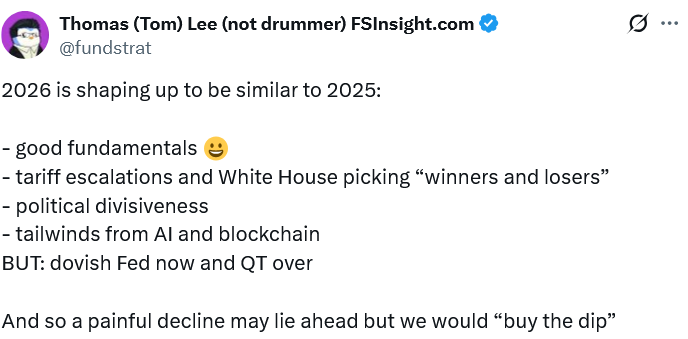 Fundstrat研究主管Tom Lee警告投资者,在地缘政治紧张局势下,2026年加密货币与股票市场可能经历一场“痛苦的下跌”,随后在年底迎来复苏。在周二接受Wilfred Frost主持的《Master Investor Podcast》采访时,Lee表示2026年将延续2025年的趋势,区块链与人工智能行业仍将获得顺风助力,但关税和政治分歧带来的风险将令市场在初期难以持续上涨。