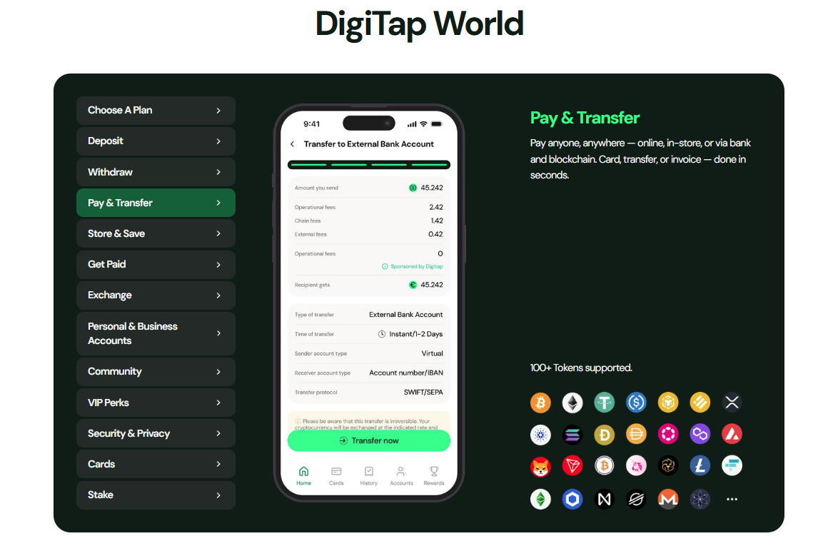 Digitap是一个全能银行,这意味着它可以利用其多轨道架构提供加密货币和法币交易。Digitap的用户可以使用银行账户、多链钱包和Visa卡在全球范围内进行交易。这使Digitap成为世界上第一个真正无边界的银行。