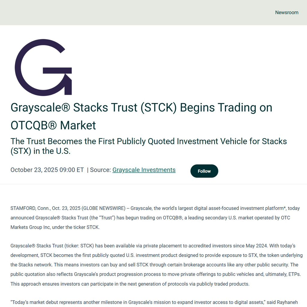 灰度新推出的STCK信托已在OTCQB®市场上市,为美国投资者提供了参与Stacks生态的全新渠道。该信托产品的推出强化了Stacks作为合规投资标的的市场认知。