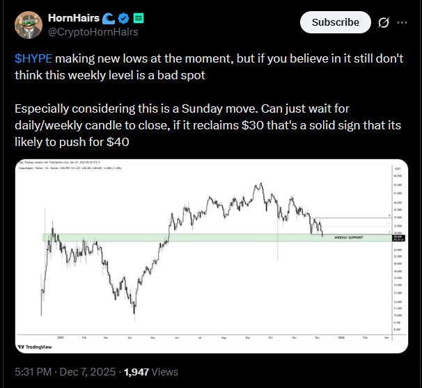 至2025年12月初,HYPE交易价达33.52美元,尽管日内下跌1.8%,周线仍保持14%涨幅,表现优于横盘的比特币。马丁内斯12月7日发布的K线图清晰标注30美元破位点:“Hyperliquid $HYPE正在跌破关键支撑位,为下探24美元打开通道”。自11月底在40美元遭遇阻力后形成的下降三角形形态表明,若成交量持续萎缩,跌势或将延续。CoinGecko数据显示当前24小时交易量2.4665亿美元,较前期峰值下降22%。
