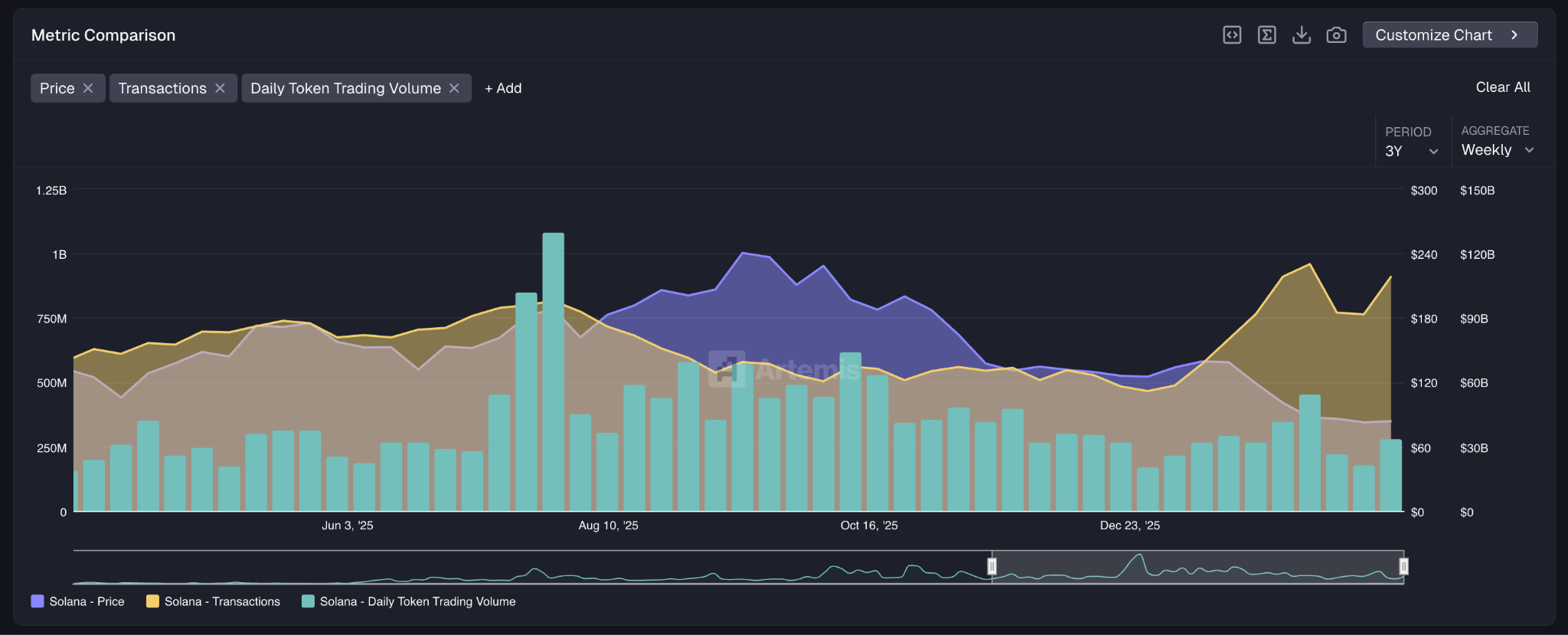 Artemis的区块链分析数据显示,周交易笔数从7.64亿笔跃升至9.1亿笔,周增幅达19.1%。