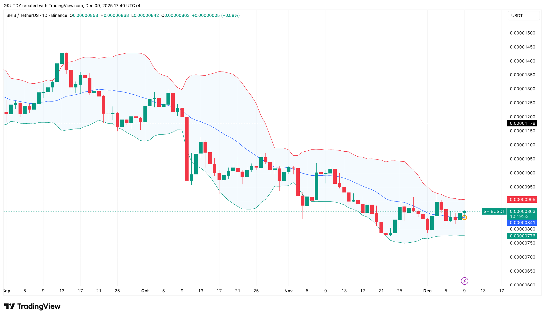 布林带指标指明了后续路径:上轨阻力位于0.0000102美元附近——若中轨防守能转化为上行动能,这里将成为首个重要关卡。当前关键是要稳守0.0000084美元支撑并维持买盘兴趣。一旦失守,SHIB可能重新下探0.0000078美元的十一月低点。