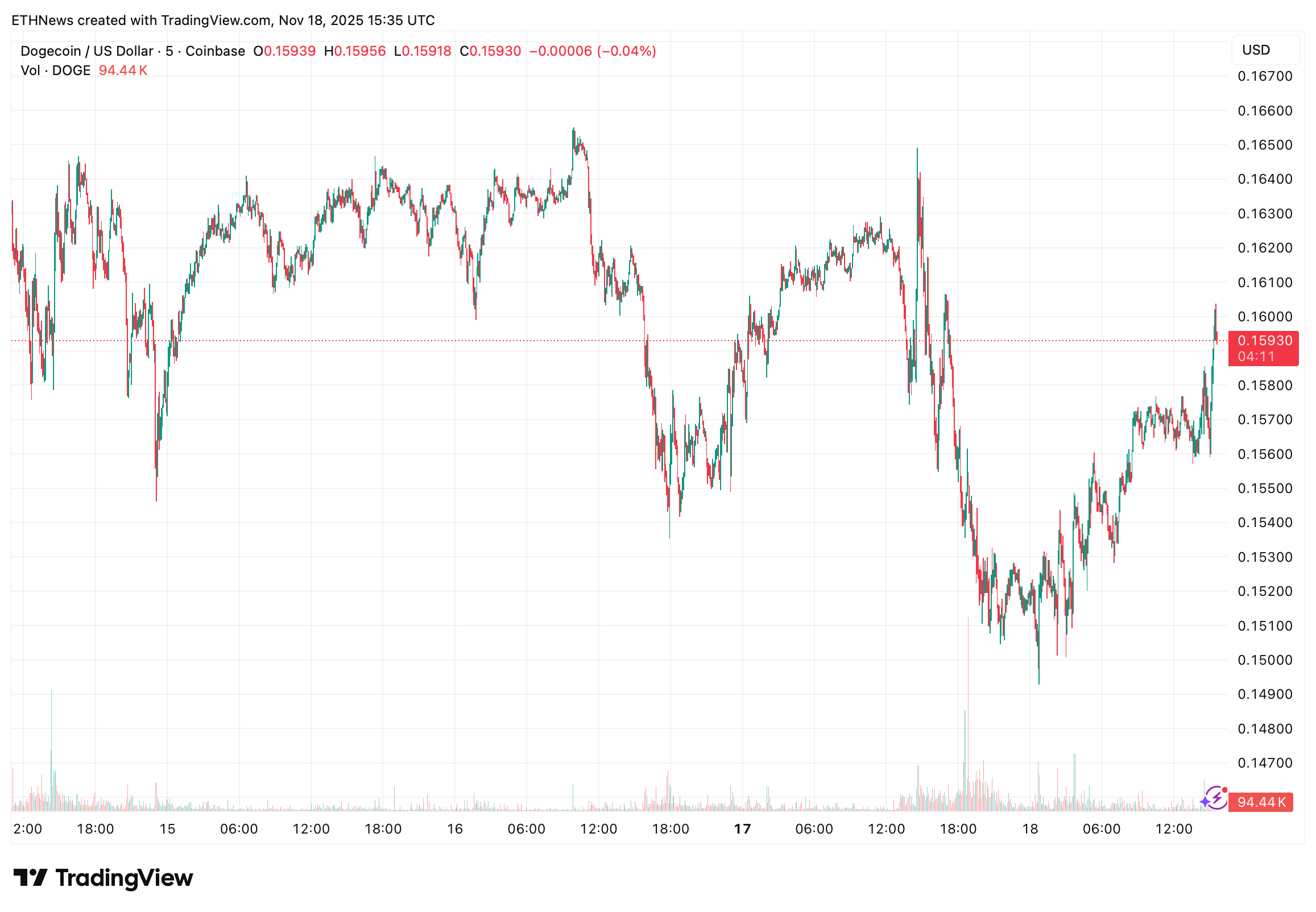 狗狗币本周重拾涨势,从日内低点强势反弹后逼近0.16美元关口