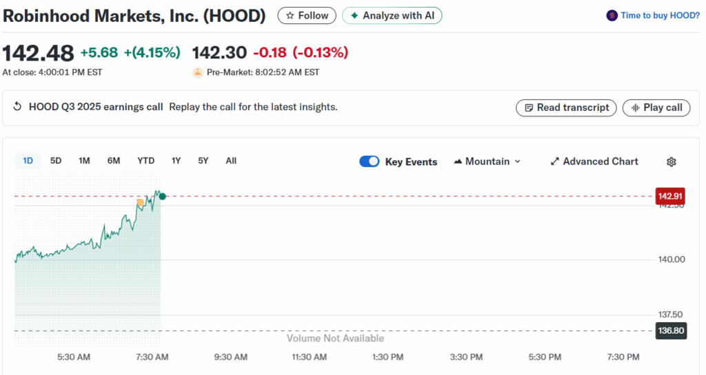 HOOD股票今日盘前微跌0.13%,报412.30美元。但该加密概念股前一交易日收涨超4%,触及142.48美元。