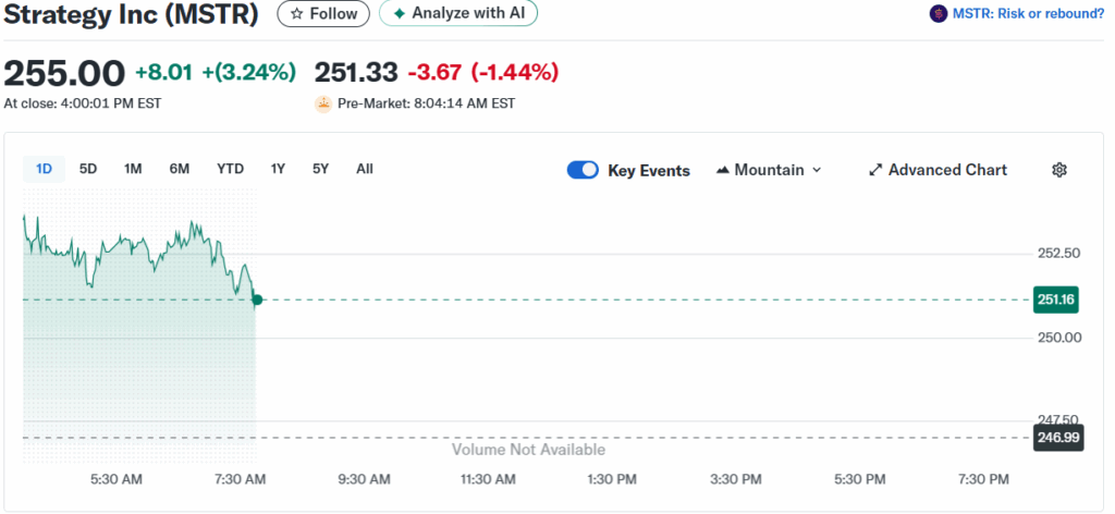 截至发稿时,MicroStrategy(MSTR)股票下跌约1.5%至251.33美元,此前交易日收报255美元,涨幅3.24%。