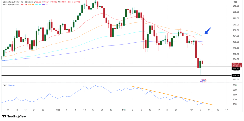 Solana难以守住155.60美元支撑位 看跌趋势加剧