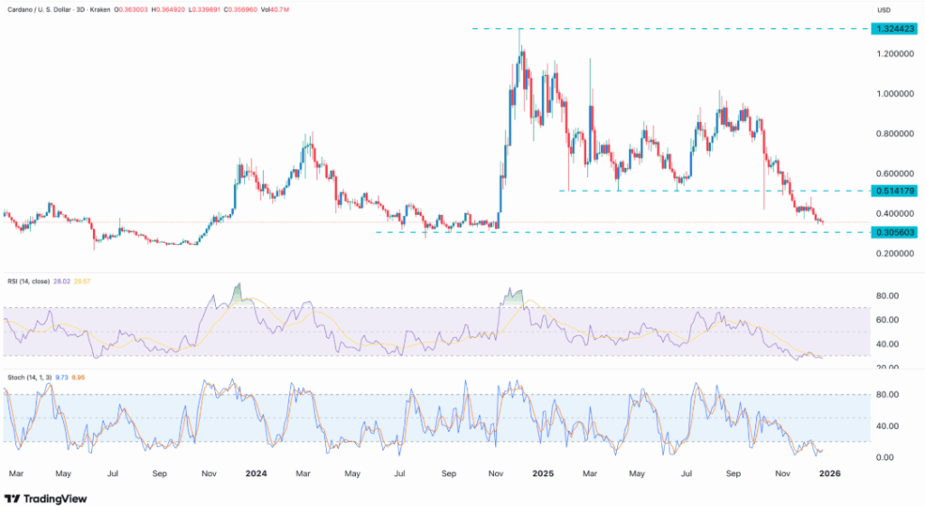 卡尔达诺本周延续跌势,滑落至0.3565美元,较12月1.3245美元的峰值暴跌73%。当前价位为去年11月以来最低点,加剧了市场看跌情绪。尽管如此,技术指标与网络数据均暗示反弹可能正在酝酿。