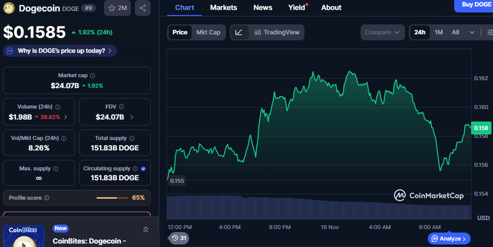 当前狗狗币交投于0.158美元附近,24小时图表呈现温和上升趋势。价格从0.155美元启动后曾短暂触及0.162美元,虽现小幅回落仍显示韧性。市值维持在240.7亿美元,但单日交易量下滑39%暗示短期参与度降低。