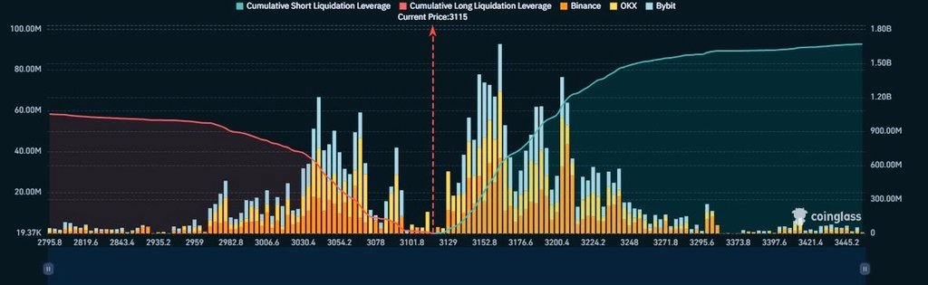 Coinglass数据显示,大量杠杆交易聚集在2,800美元至3,400美元之间。
