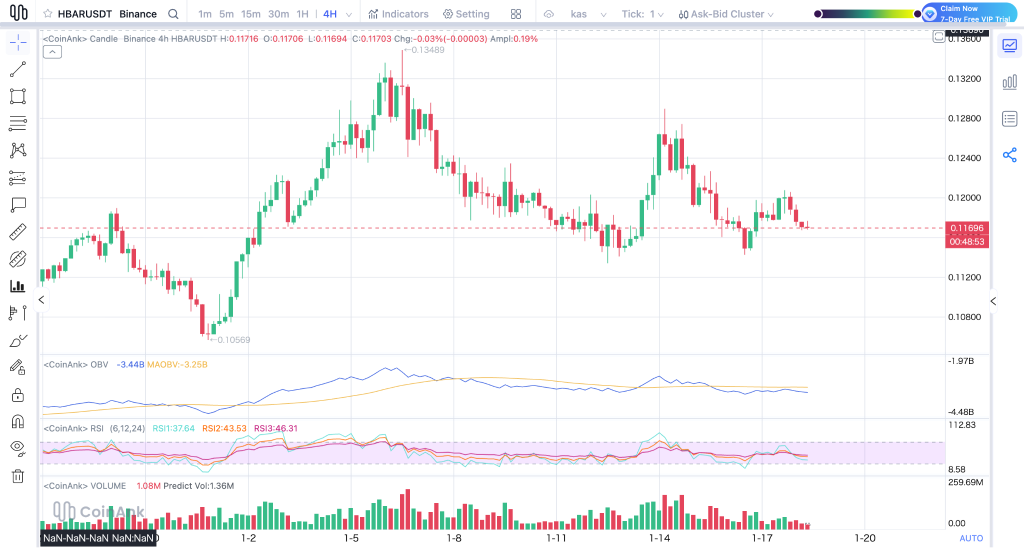 从四小时图观察,HBAR近期已回落至七日移动均线(约0.119美元)下方。该均线原本构成短期支撑,失守后价格并未迅速反弹,而是温和走低。尽管波动幅度有限,却表明每次HBAR尝试上行时卖压依然存在。