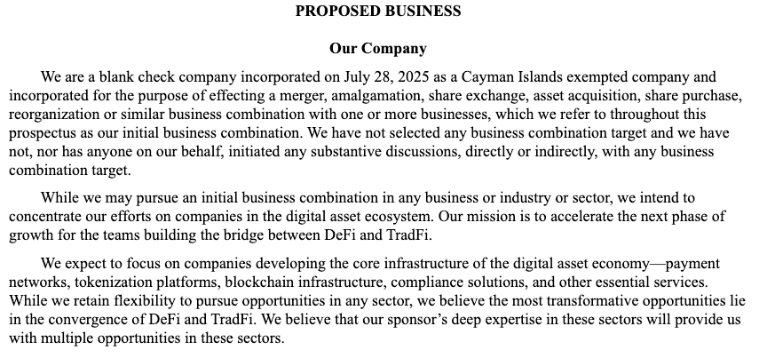 公司在备案中明确战略方向:"虽然可能考虑任何行业的业务合并,但我们将重点关注数字资产生态系统的企业,致力于加速连接去中心化金融与传统金融的桥梁建设。"