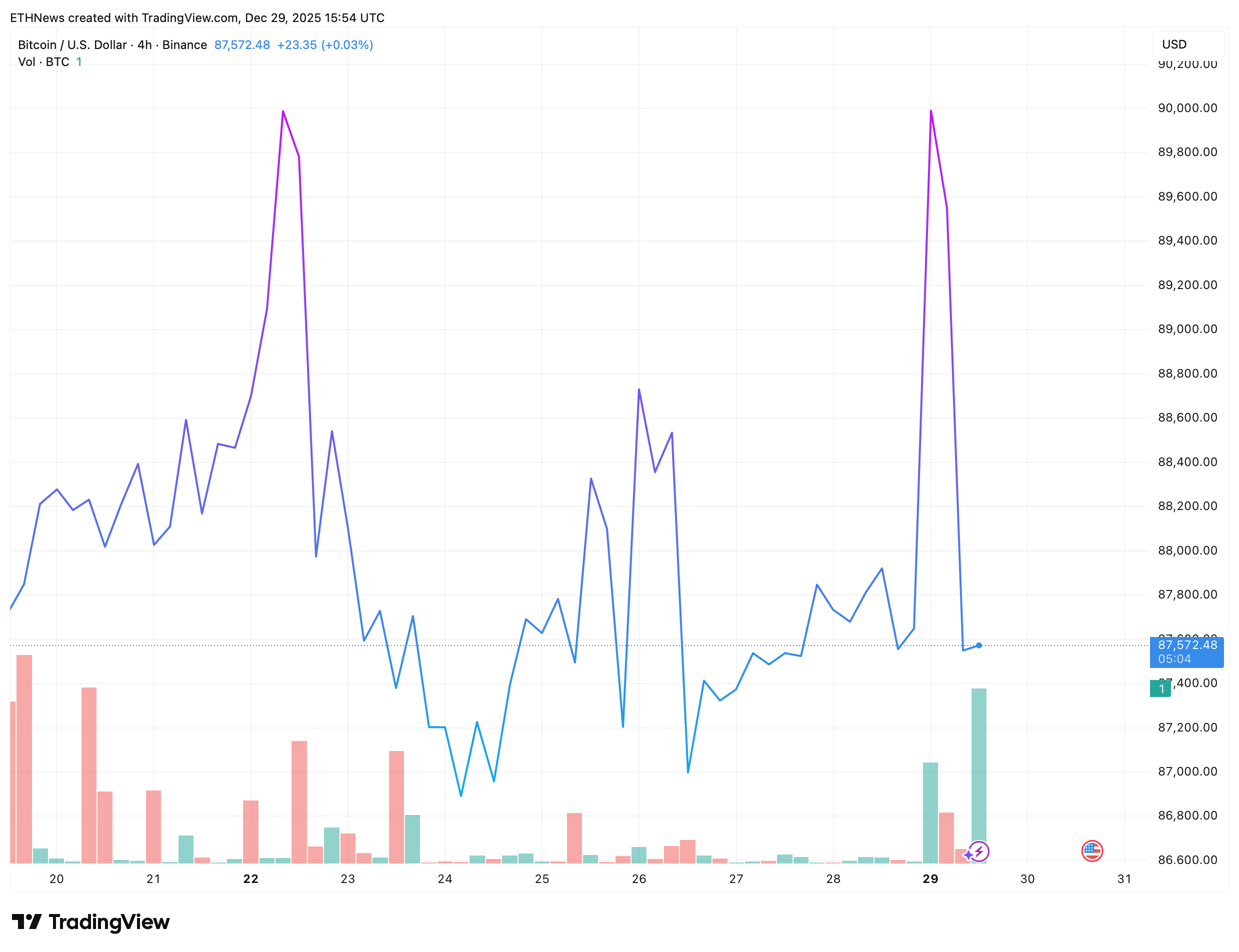 4小时图显示,比特币呈现明显的急涨急跌序列:价格快速冲高至90,000美元区域后遭遇坚决拒绝,迅速回落至87,000美元下方。这些垂直波动伴随着短暂的成交量爆发,凸显市场在此阶段的过度反应。