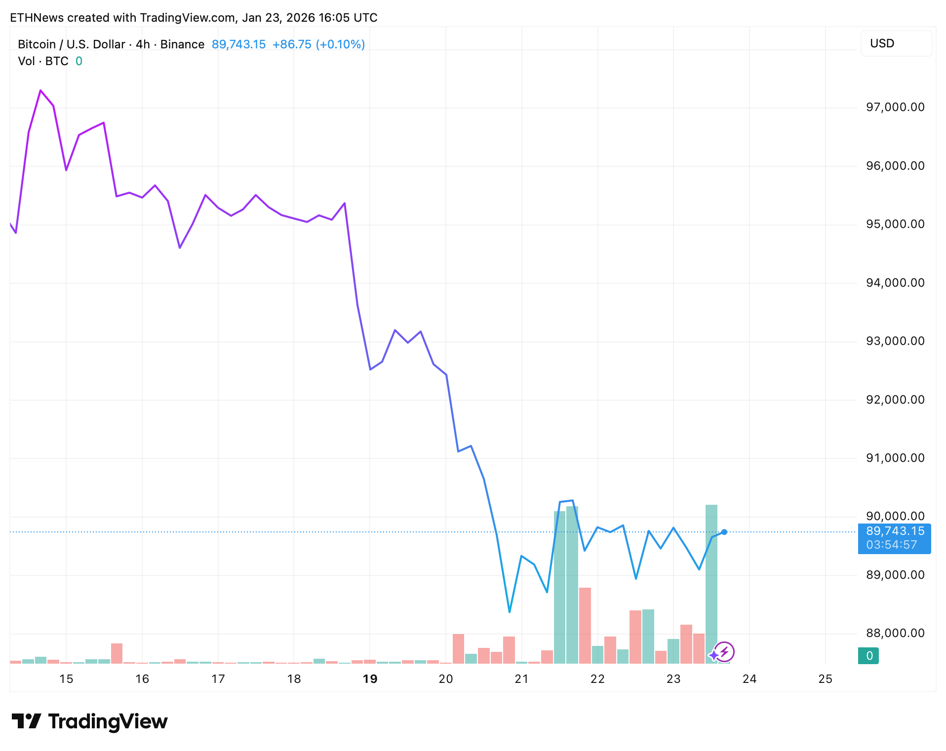 本周早些时候向上方阻力区域的试探失败后,价格遭遇坚决回绝并滑落至区间中部。此次受阻是关键信号。此后,比特币一直在89,700至90,000美元附近横向震荡,虽有短暂的反应性反弹但缺乏持续性,这是上行动能减弱的典型特征。