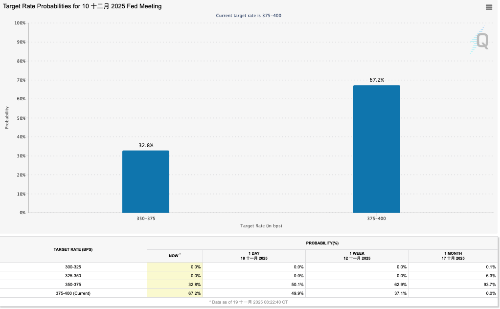 美联储10月会议纪要显示,许多央行官员认为在2025年底前维持利率不变可能是合适的。根据CME FedWatch工具,交易员对12月10日降息25个基点的概率已跌至32%。由于数据缺失及关税影响的不确定性,市场不确定性较高。