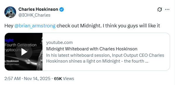 卡尔达诺创始人查尔斯·霍斯金森通过在社交平台X上联系Coinbase首席执行官布莱恩·阿姆斯特朗,使Midnight Network重新成为行业焦点。这则简短留言邀请阿姆斯特朗关注该项目,恰逢Midnight持续强化其在隐私领域布局之际。