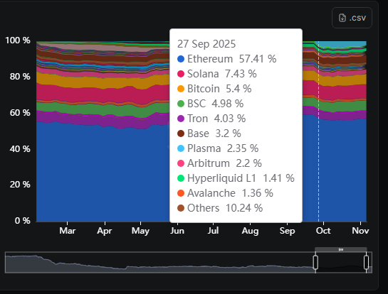 第三季度标志着DeFi地理布局的决定性转变。多链TVL急剧上升,但最显著的趋势是资本向以太坊回流,基于ETH的TVL实现超50%的季度增长。用户回归以太坊的核心原因在于其无与伦比的稳定性、流动性深度和基础设施成熟度,这些优势仍是新兴链难以复制的。