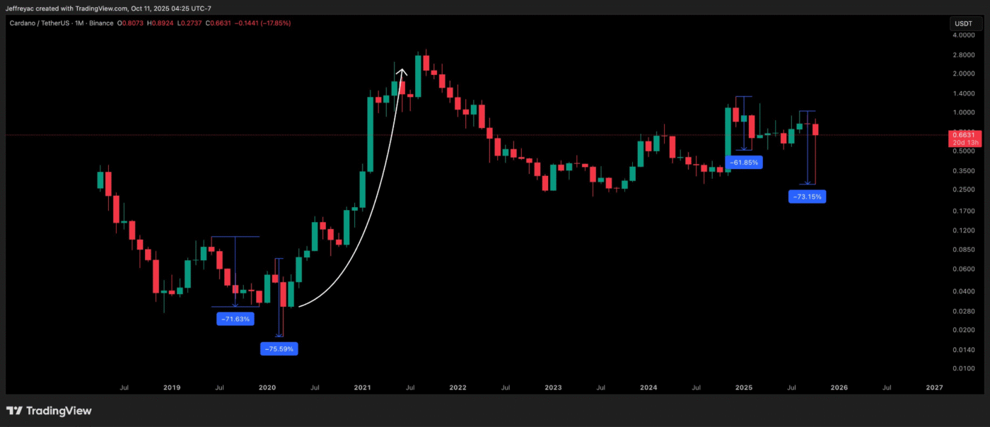 在中美贸易紧张局势引发的加密货币巨震后,卡尔达诺价格持续承压。短短数小时内市场蒸发近190亿美元,ADA一度跌至0.30美元低点,最终稳定在0.65美元区间。