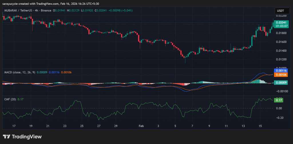 MUBARAK的移动平均收敛发散指标线位于信号线上方,表明动量维持正值。看涨金叉保持活跃,由于双线皆处于零轴上方,整体趋势仍偏向多头。