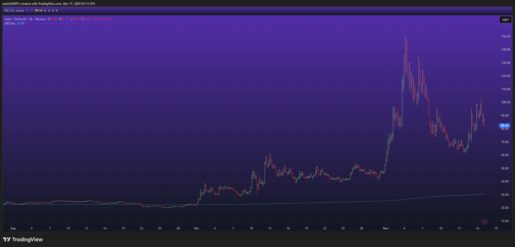 自峰值回落以来,DASH已显著降温。当前82美元左右的价位属于健康回调而非结构破坏。图表呈现以下重要技术节点: