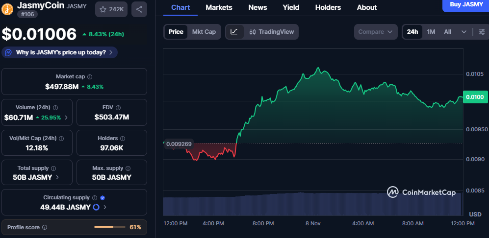 JASMY早盘下探0.0092-0.0094美元区间后强势反弹,最高触及0.0105美元,当前交投于0.0100美元关键位下方。24小时内8.43%的涨幅配合成交量26%的增长,显示市场参与度显著提升。