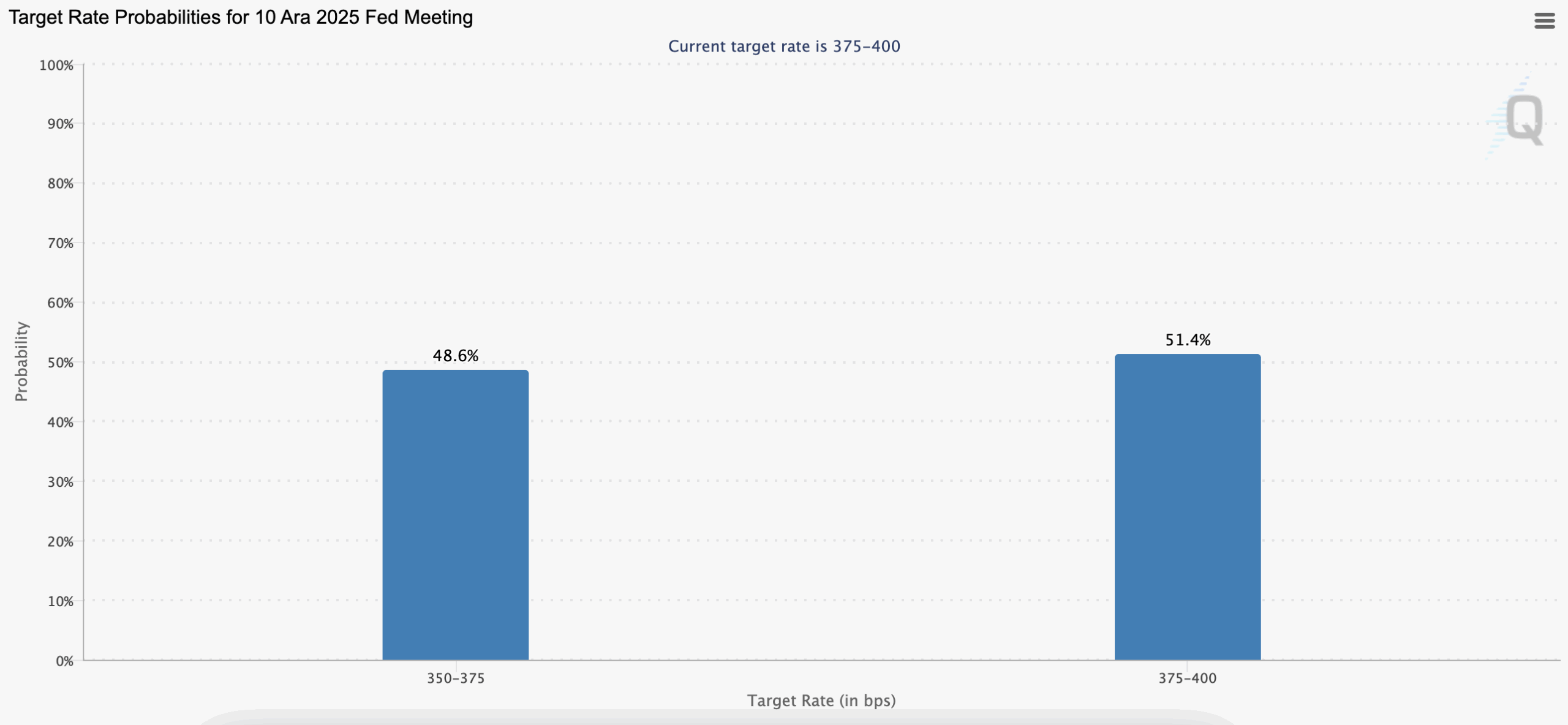 美国政府临时停摆导致财政部账户资金冻结,加剧流动性紧张。此外美联储可能推迟12月降息的预期削弱市场信心。CME FedWatch工具显示当前降息概率仅为48.6%。