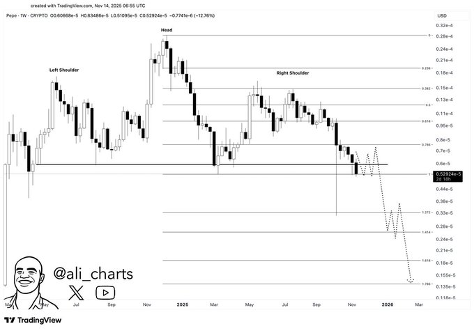 分析师Ali(@ali_charts)指出PEPE已形成确认的头肩顶形态。周线图上清晰呈现左肩、头部及右肩的完整结构,颈线位作为关键水平曾长期主导市场活动。