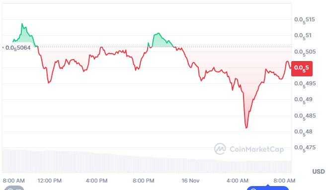 PEPE现报0.000005009美元,日内跌幅1.09%。24小时图表显示早盘急跌后快速反弹,形成狭窄盘整带,这种波动反映市场缺乏方向性共识,以反应式交易为主。