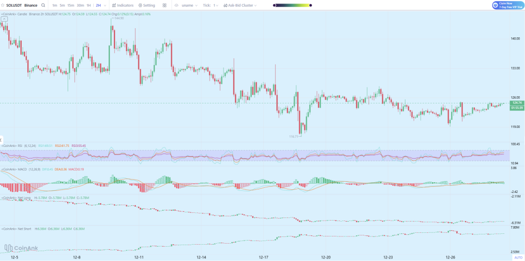 临近岁末,Solana在经历月中大幅抛售后走势趋于平缓。从2小时图来看,SOL价格从12月中旬的140美元中段开始下滑,在116.7美元附近形成快速投降下影线,随后进入窄幅整理区间。