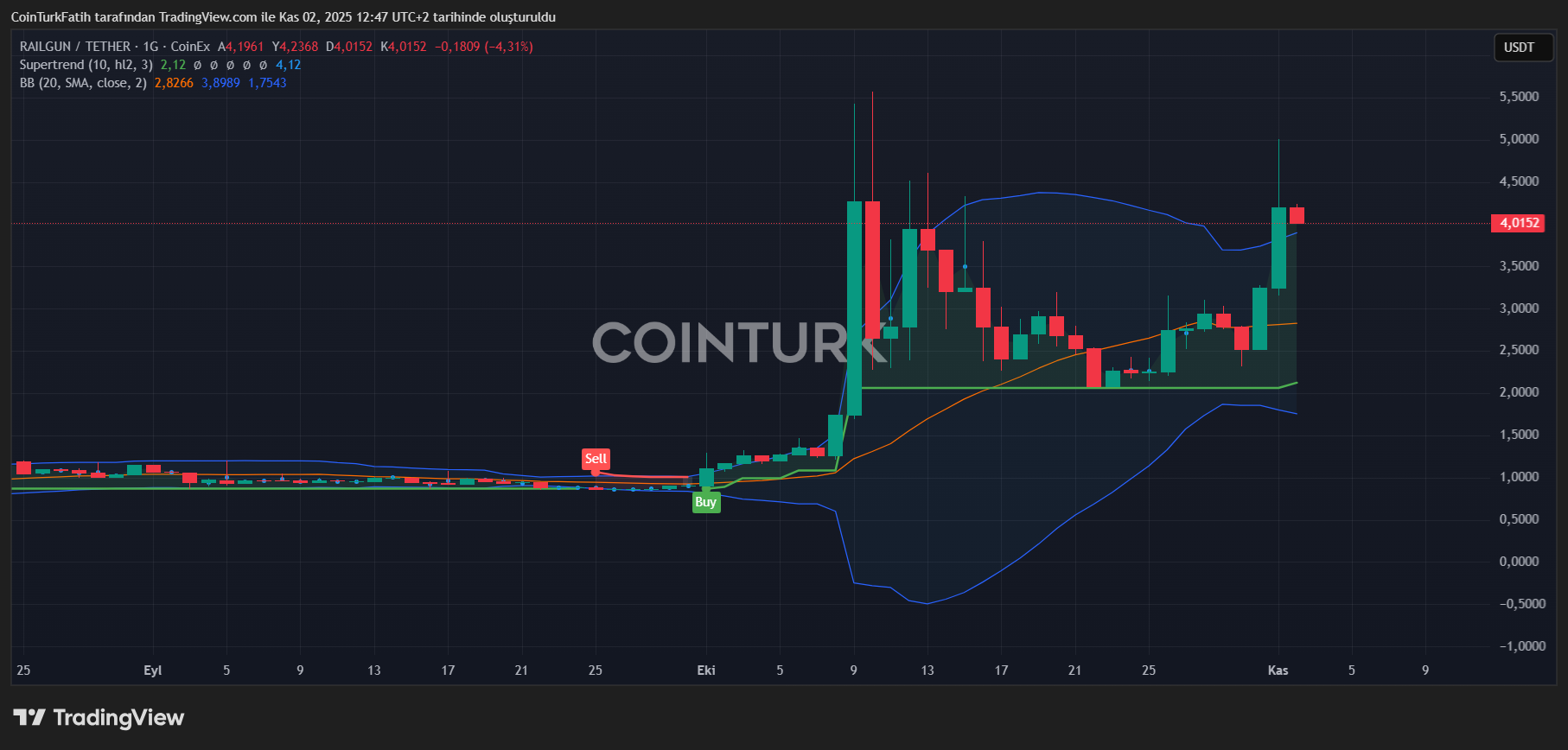 Railgun(RAIL)近期突破1290天以来新高。虽然多次测试4.28美元未果,并回落至2.53美元和2美元支撑位,但当前再次触及阻力位后,面临关键抉择:若能突破4.28美元,则有望挑战5.6美元阻力位;反之可能依次测试3.19美元、2.53美元支撑后回落至2美元关口。