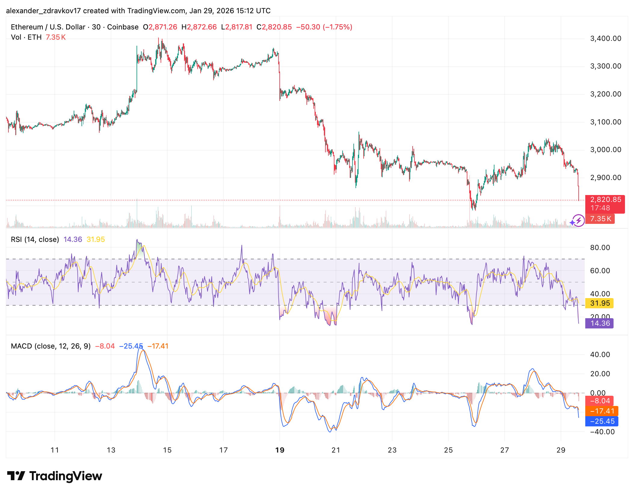 从技术面看,以太坊显现出明显的短期疲软信号。相对强弱指数已跌至30以下的低位,接近超卖区域,这既表明卖压强劲,也增加了短期反弹的可能性。