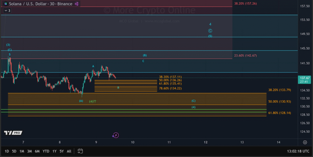 根据技术分析,Solana($SOL)目前正处于B浪回调阶段。据Morecryptoonl分析,Solana正逼近134.22美元至137.11美元的关键支撑区间。这一区域对B浪调整的延续至关重要,交易者正密切关注该水平以判断价格将企稳还是反转。