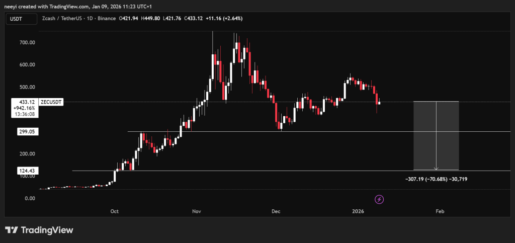 在辞职消息公开之前,Zcash价格已然承压。自12月下旬在约559美元见顶以来,ZEC价格一直呈下跌趋势。截至撰稿时,价格交易在430美元附近,呈现稳步下跌而非突然崩盘的态势。