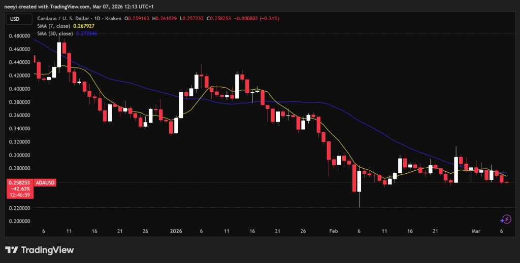卡尔达诺价格在过去一周小幅走低,目前交易于近期区间的底部附近。ADA目前位于约0.258美元,接近周低点0.258美元,并低于近期高点约0.286美元。0.26美元区域现在是关键的短期支撑区。价格近期在该区域附近创下了新的周内低点。若决定性跌破0.26美元,可能确认当前小型下跌趋势的延续,并为跌向前几周看到的更低水平打开空间。