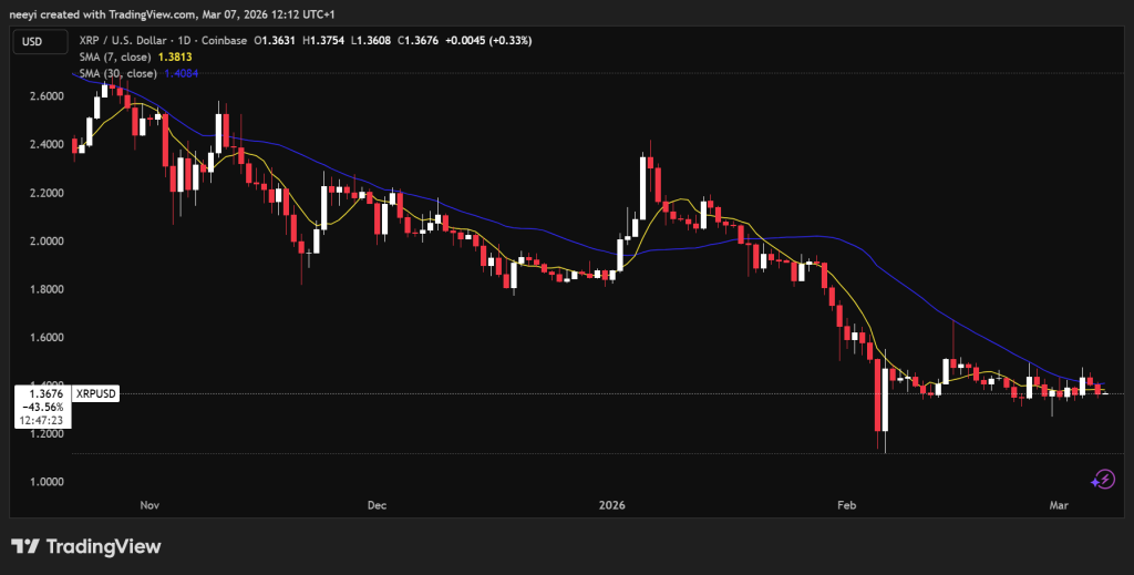 上涨动能取决于1.40美元至1.42美元的阻力带。明确突破该区域将确认XRP价格仍处于短期上行结构中。